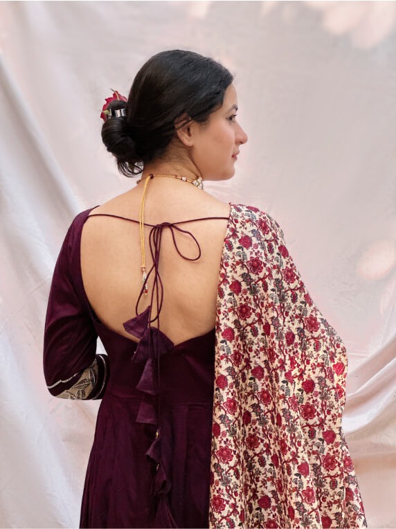 To complete the look, pair this full flare anarkali with silver or metallic accessories and duppatta from our wide range for a cohesive and radiant ensemble. Style your hair in an updo to accentuate the backless design, and opt for minimal, understated makeup to let the outfit take center stage.
